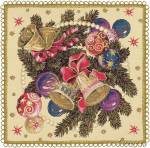 Купонная скатерть новогодней тематики из очень плотного, тяжелого гобелена, обильно украшенная золотой блестящей нитью. Центр скатерти усеян мелкими колокольчиками, звездочками и елочными шарами. По периметру скатерти идет полоса из новогодних украшений и еловых лап шириной примерно 35 см. Все елочные игрушки, бусы и колокольчики вытканы с применением золотой блестящей нити, равно как и колокольчики по центру. Изделие отлично подходит для создания праздничного настроения. Наибольший эффект от скатерти можно получить на столе с размером столешницы 70х100 см, чтобы центр скатерти покрывал всю столешницу.
